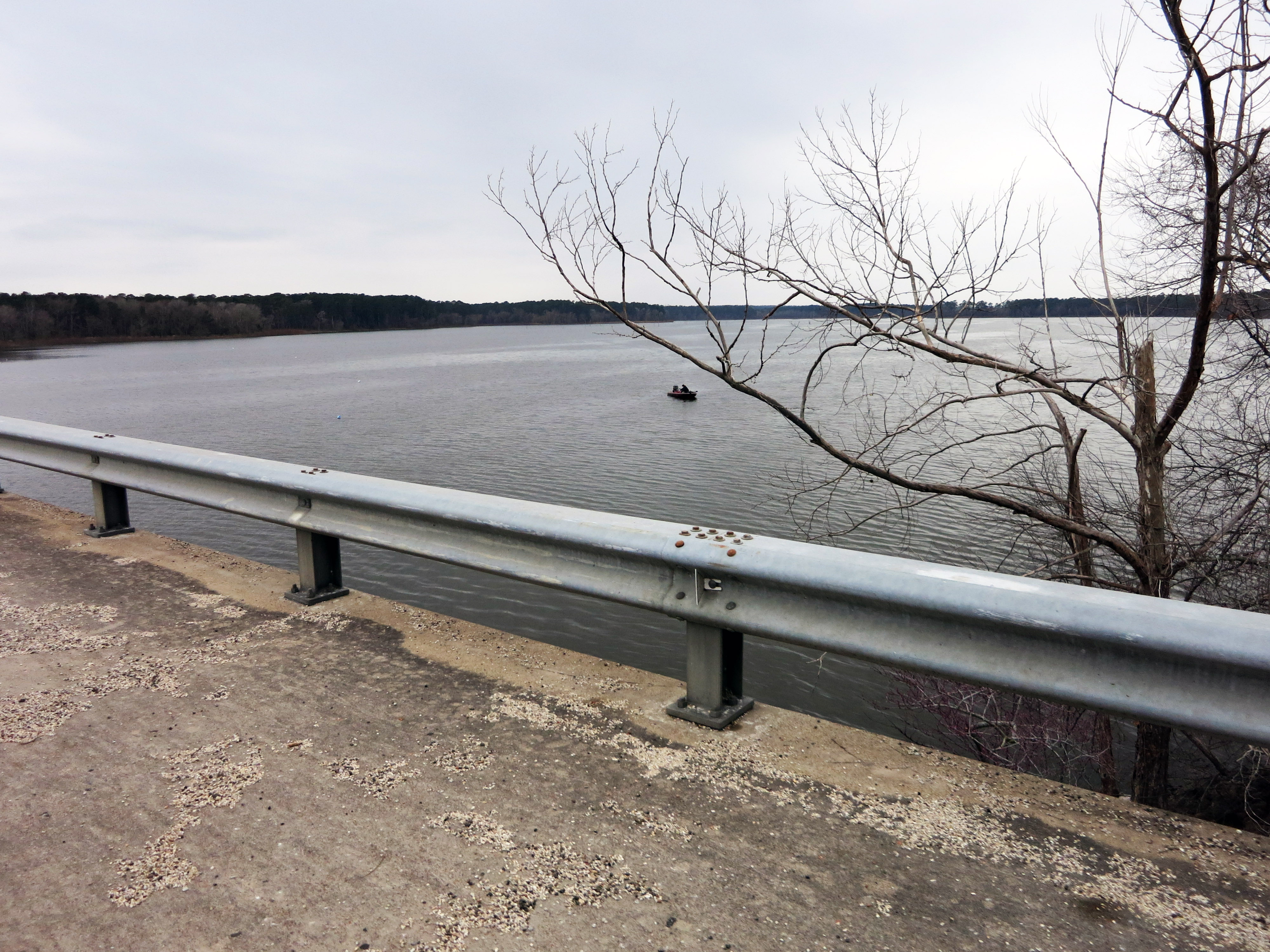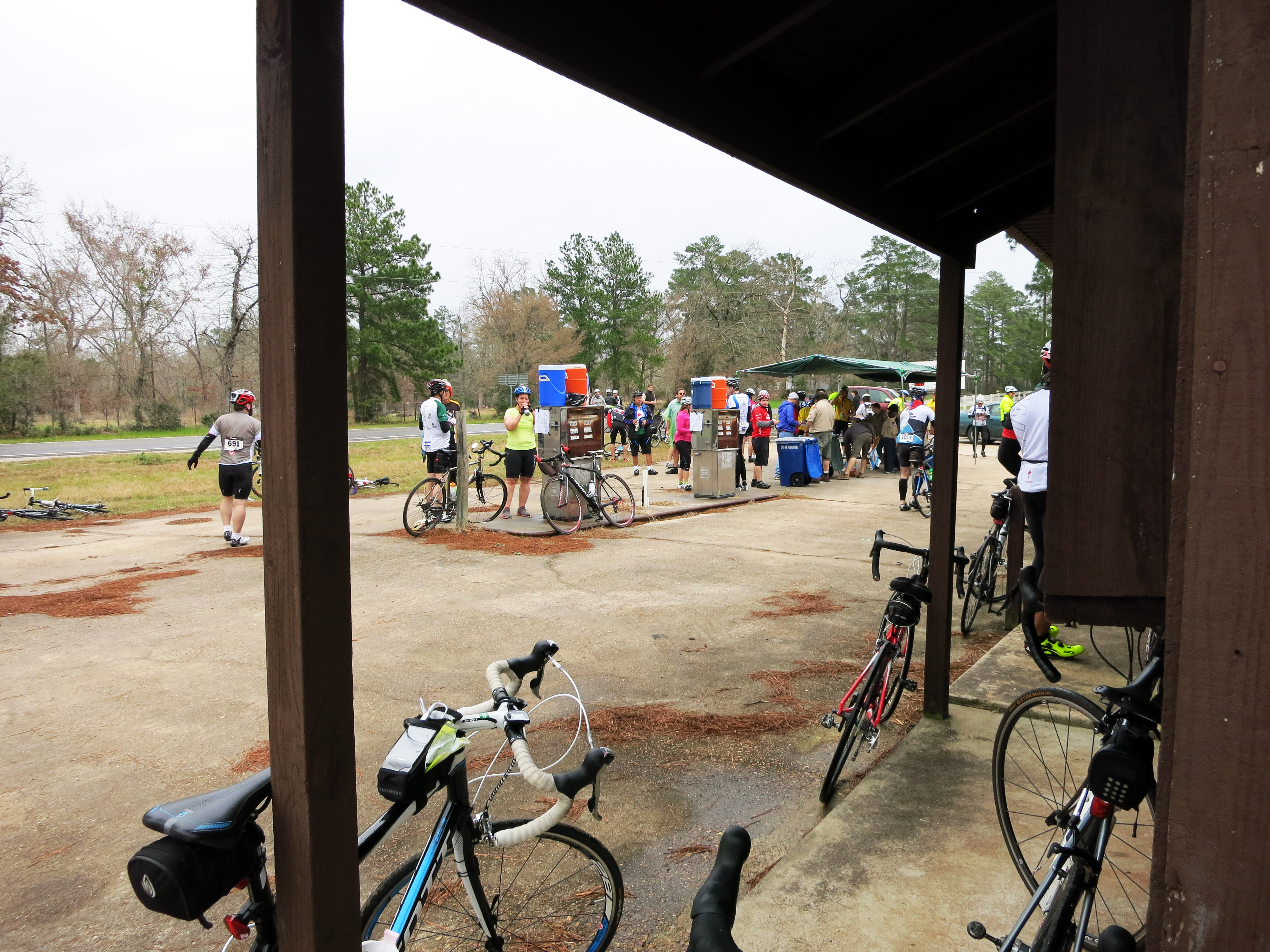 It’s unfortunate the weather didn’t cooperate as well as it could have. The skies were suicide grey all day, and while I only got drizzled on for about 10 minutes and the roads were mostly dry, there was still the threat of rain at any moment. The temp was in the upper 50s by mid morning, but a chilly breeze was blowing on and off. It’s too bad too because the scenery would have been magnificent had there been sun and blue skies. As it was, the scenery was pretty great despite the gloom. The routes took riders through Sam Houston National Forest, Huntsville State Park, and across Lake Conroe. Riding through the woods was wonderful.