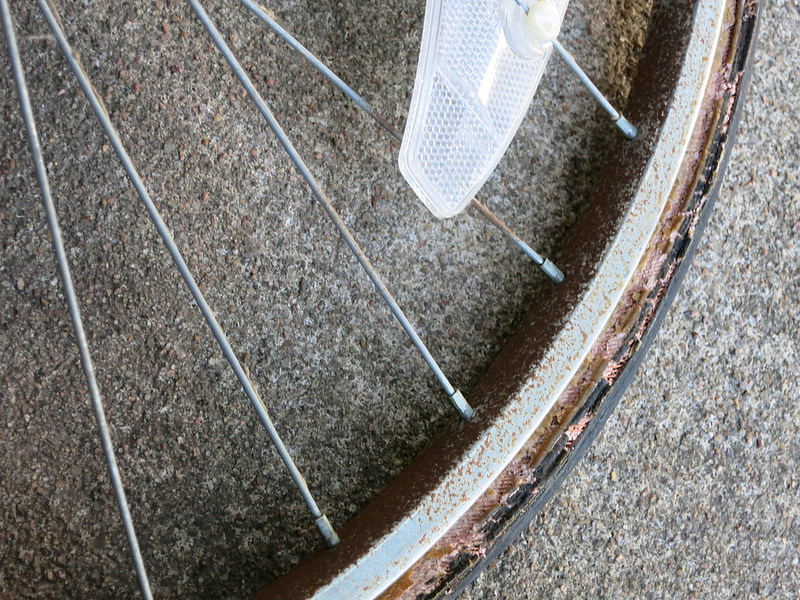 14455979965_6f56117460_cWhile I was waiting for components to arrive, I worked with what I had. Putting the tubes and tires on the wheels wasn’t much of a problem. I was trying out foldable tires for the first time instead of traditional tires with a wire bead. They’re a little more puncture resistant, and easier to get onto a wheel – apparently. I was told I could do it without the use of a tire lever – but I couldn’t. Needed that leverage to pop the very last part of the tire into the bead slot. But they looked nice nonetheless. These were also the narrowest tires I’ve ever ridden on as well. I’m used to fatter tires on a mountain bike or my Cross-Check. Oh, and they were mostly slick. I’ve never ridden slicks before.