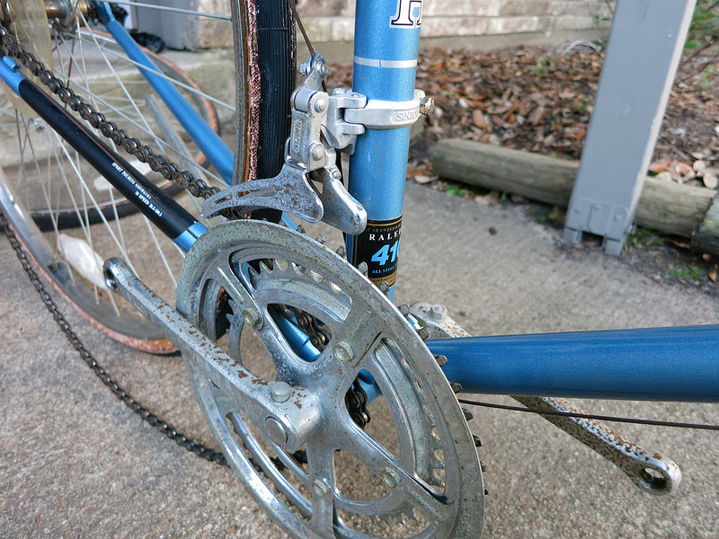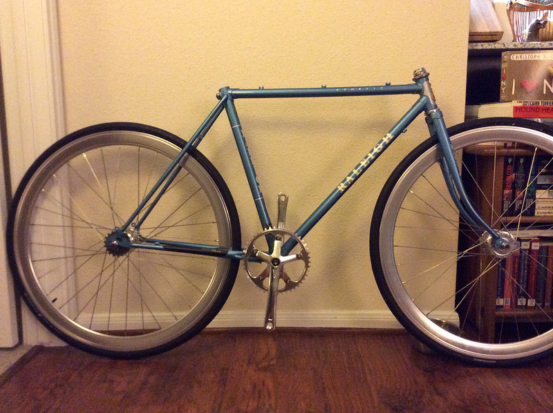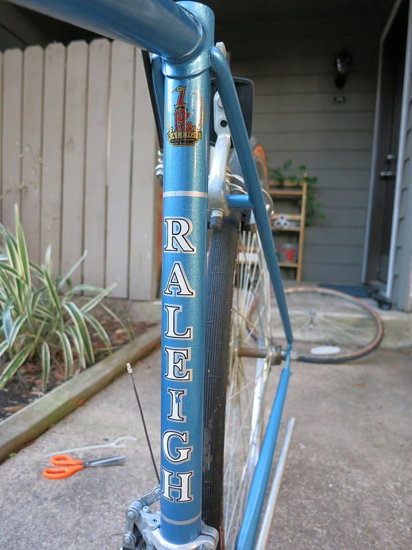 After getting a taste of working on a bike myself by swapping out the handlebars and stem on my Cross-Check, I knew I wanted to learn more about bike 14356479075_b7c87bfa88_cmaintenance and eventually putting one together as a project. I recalled riding my Aunt’s old Raleigh when I spent summer days at my Grandparent’s house. It hung, unused (except for me periodically), in the garage then and still did now. It had been hanging in the garage for probably over 20 years. So I asked my Aunt if I could have it for a project. She obliged and I asked my dad to check out it’s condition, and if it was worth it, to ship it down to Texas from New York.