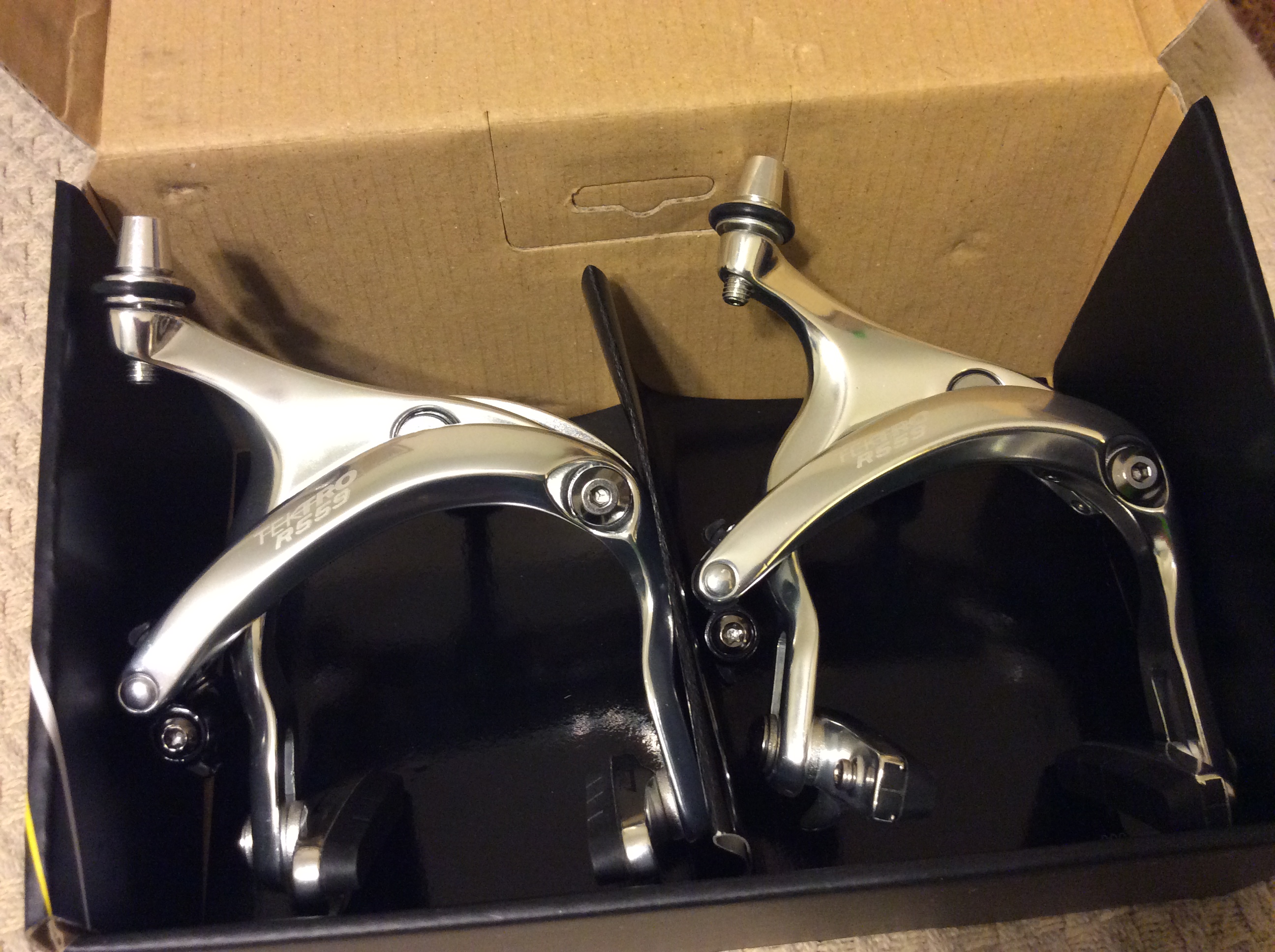 IMG_5972IMG_7017Turned out I needed long-reach brakes because the original wheels I chucked were actually 27″ wheels – which I understand was pretty standard back then. Today’s standard 700c wheels are actually smaller, so for the brakes to be attached to the frame and still be able to reach the rims, they need to have a longer reach. This is a common issue so long-reach brakes are fairly common. Tektro is pretty much the standard for brakes these days, so they didn’t disappoint.