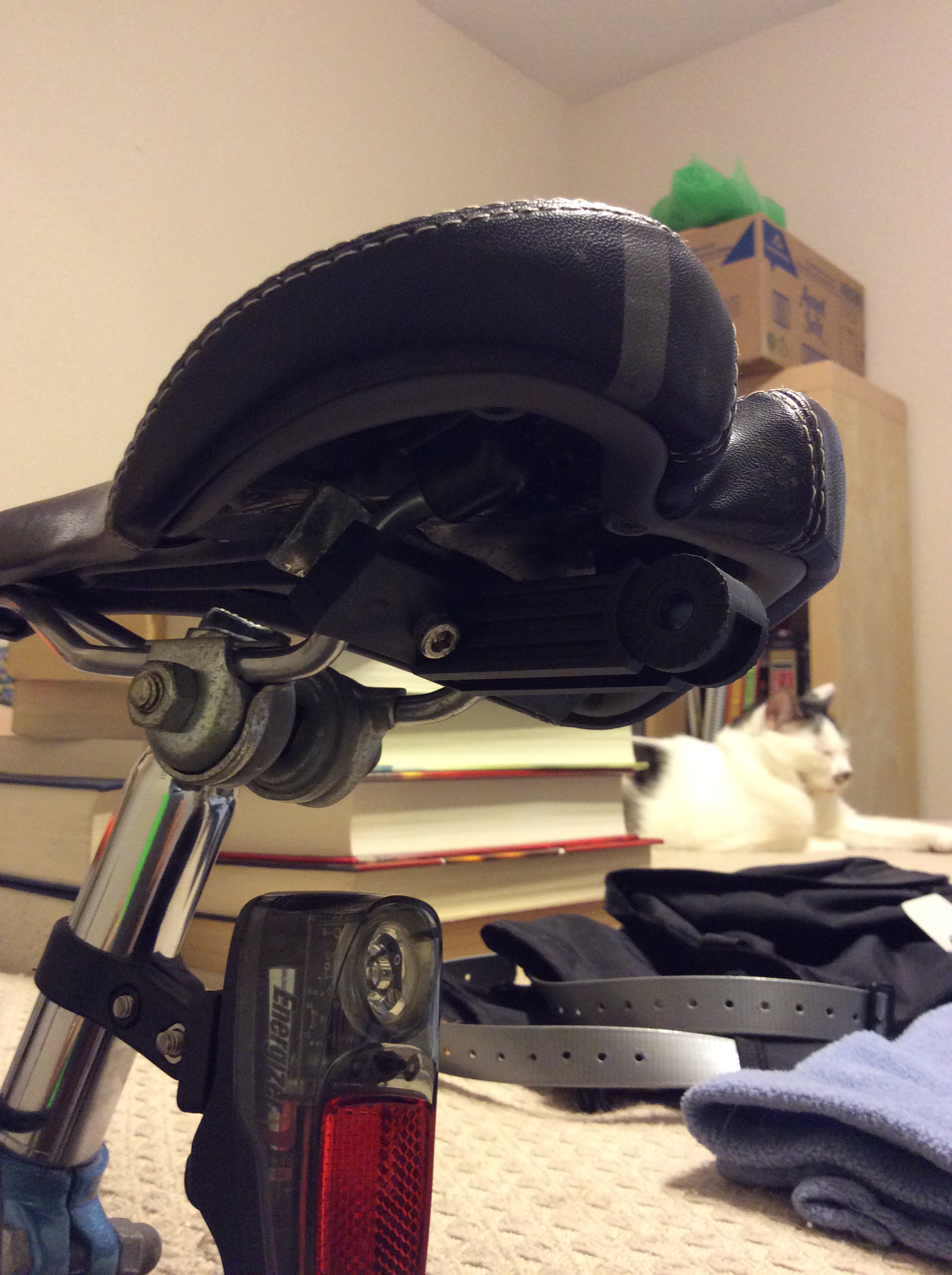 The clamping system seems a little flimsy and cumbersome all at once. The metal plate on the inside is curved/shaped to align with the rails on the underside of your saddle – but it didn’t on mine. It was…close…(using the word liberally), but it didn’t clamp perfectly so I had to rely on tightening it enough so the pressure held it in place. Now on the flip side is the problem with that need – the other plate is just plastic – as you can see in the above picture. I was fairly nervous about tightening the screws enough to clamp it down because plastic breaks easily enough. Thankfully – so far, so good.
