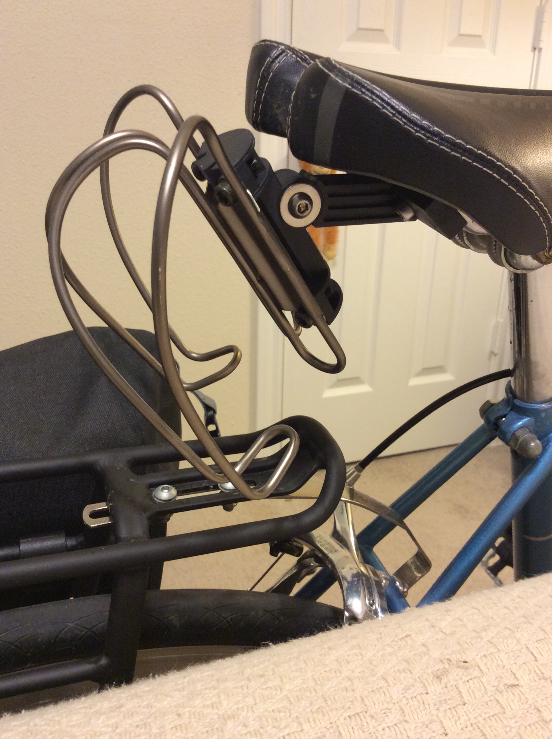 So here are some pics from my assembly of the Tacx behind the saddle bottle cage mount, and some notes to go with them. It’s a bit quirky and also has a few flaws, but overall it’s working alright. Read on…