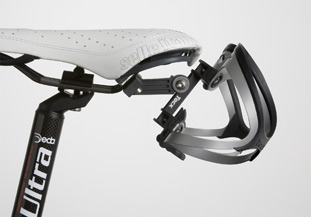 zadelklem-leftI came across the Tacx mount, and thought I’d give it a try since the price was much more reasonable. Here is the picture you’ll see on Tacx’s website as well as on Amazon (where I got it from). As you can see they’ve got it outfitted with a nice carbon-fiber bottle cage – which is extra of course. In fact the picture is very  misleading because the bottle cage itself is what the eyes are drawn to first – not the actual mount. The good thing it the mount will receive pretty much any type of bottle cage – since they are all pretty much a standard size. But still, it looks pretty simple and low profile; an advantage this had over the Profile Design as well – it’s not big and bulky.