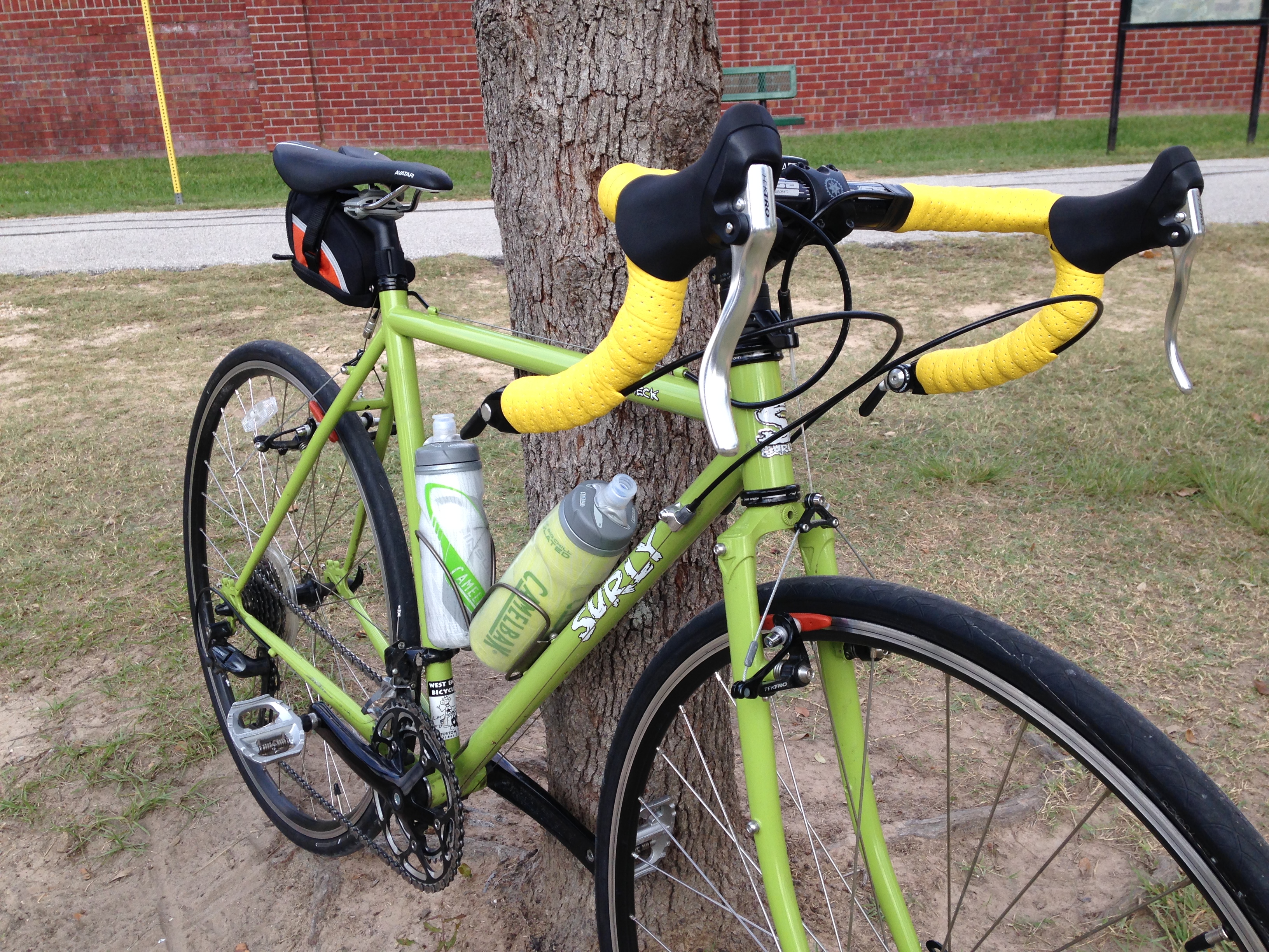 It was good because I was ready for a new color and the orange was getting dirty. This also allowed me the opportunity to move my hoods forward a little (something else you can’t do when your bars are wrapped). I usually order my bar tape from Amazon, but since I needed it immediately, I went to the LBS to grab some. I’ve been very pleased with the Profile Design cork wrap – offers great cushion and looks good. There is only one shop around that I’ve found that sells it but they only carry orange, green, and purple. Three fabulous colors but I’m not much of a purple guy even though it’d probably look great with my green bike. Green obviously is too close in color, and I was trying to switch from orange.