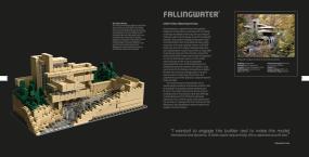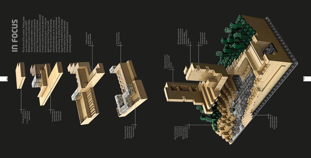 Next, we have a few pages dedicated to just showcasing the model from a few different angles. The smaller paragraph of text points out how some certain aspects of the original building are represented in LEGO form. Interesting parts of the build are labeled with details, and the top right corner shows the production details of the set, like designer, release date, and number of bricks, to name a few. (see below)