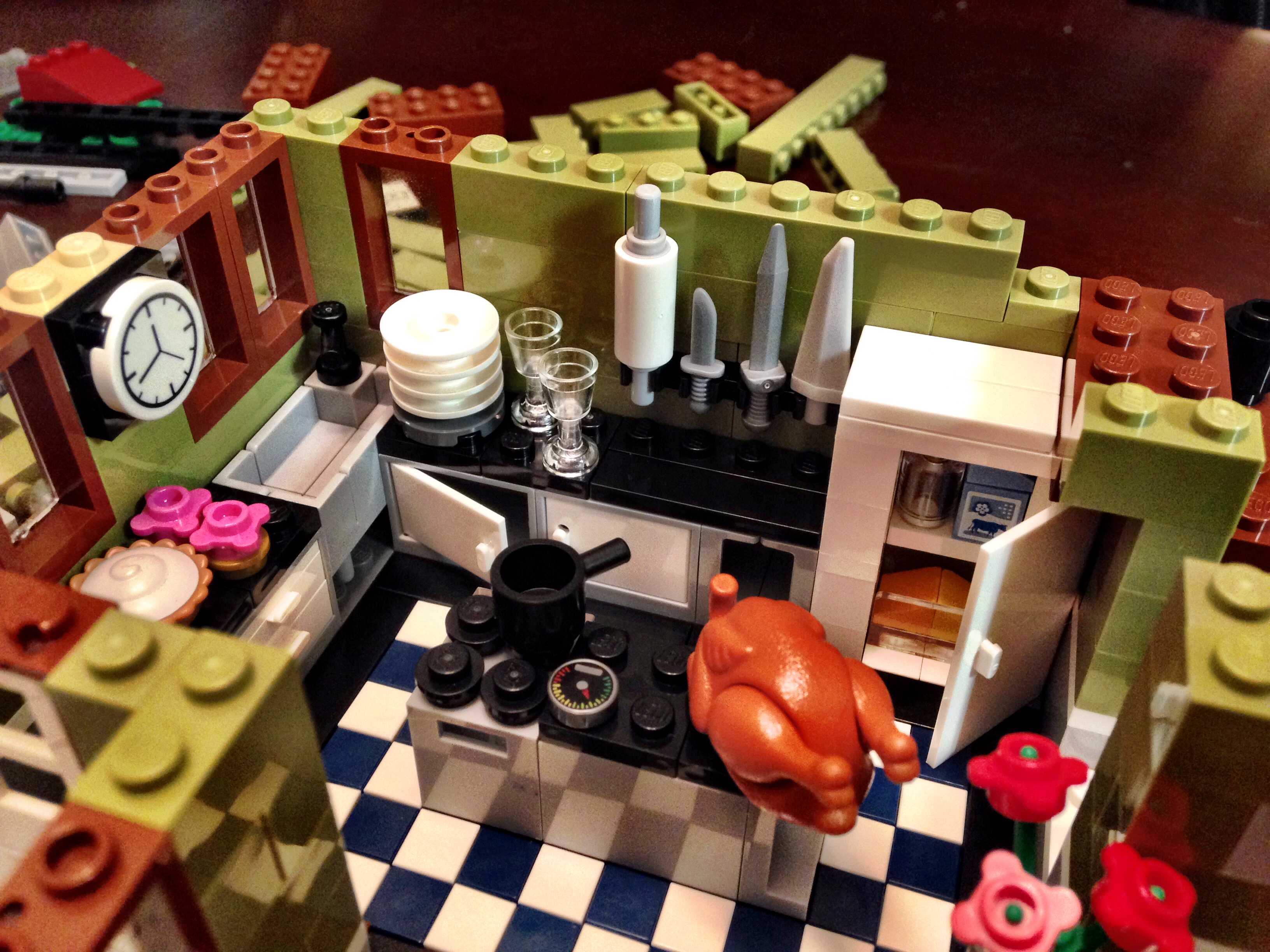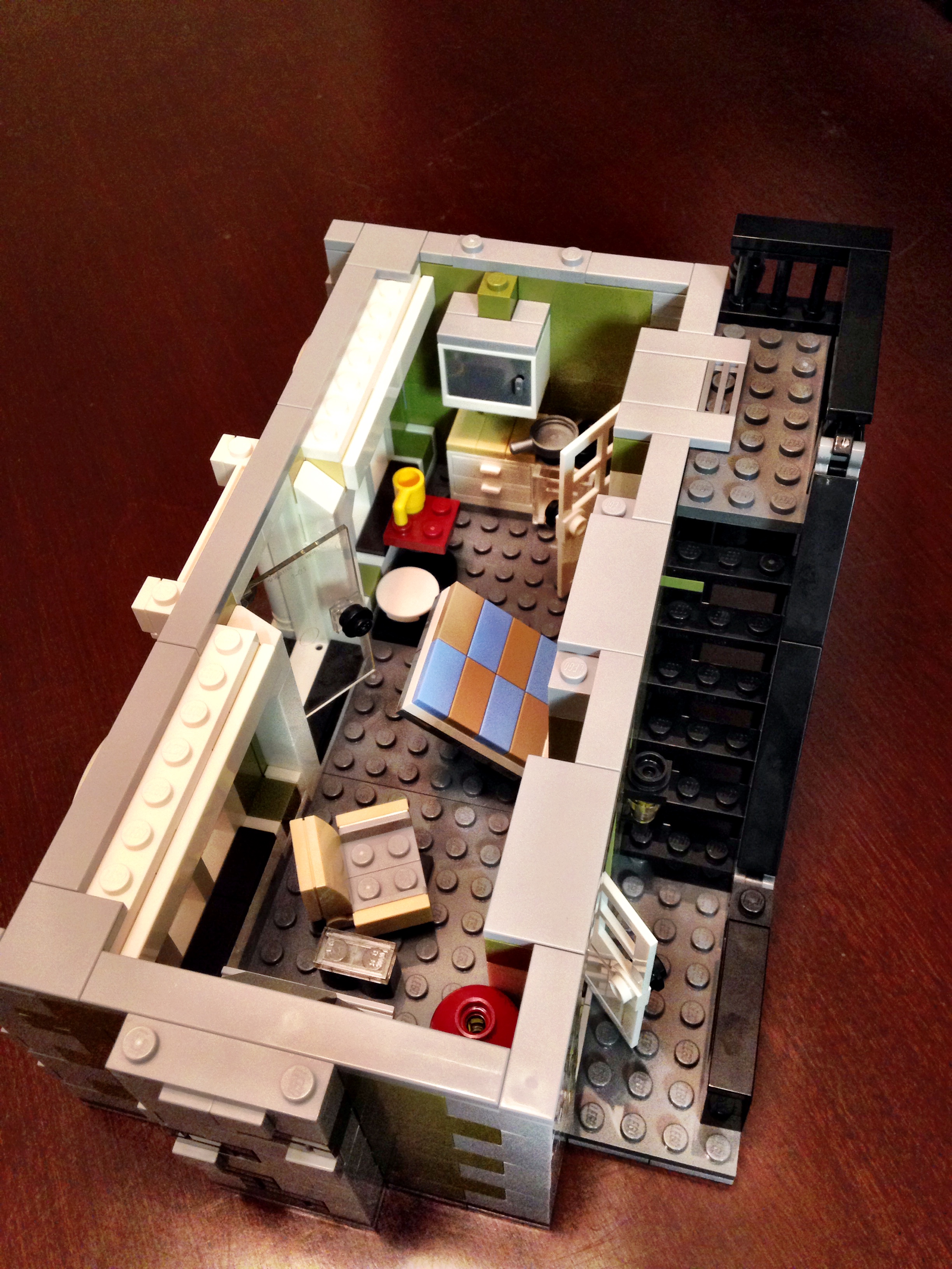A more complete shot of the kitchen almost completed. I’m blown away by the detail here. The sink is especially cool, and so is the fridge in the right corner. I’m not quite sure what the blade all the way on the right is because I’m pretty sure it could be used to fight a dragon. But the rolling pin is a great detail, as is the stack of plates and the glasses. Honestly, the kitchen might be the highlight of the entire building (though the Murphy Bed upstairs is pretty brilliant.