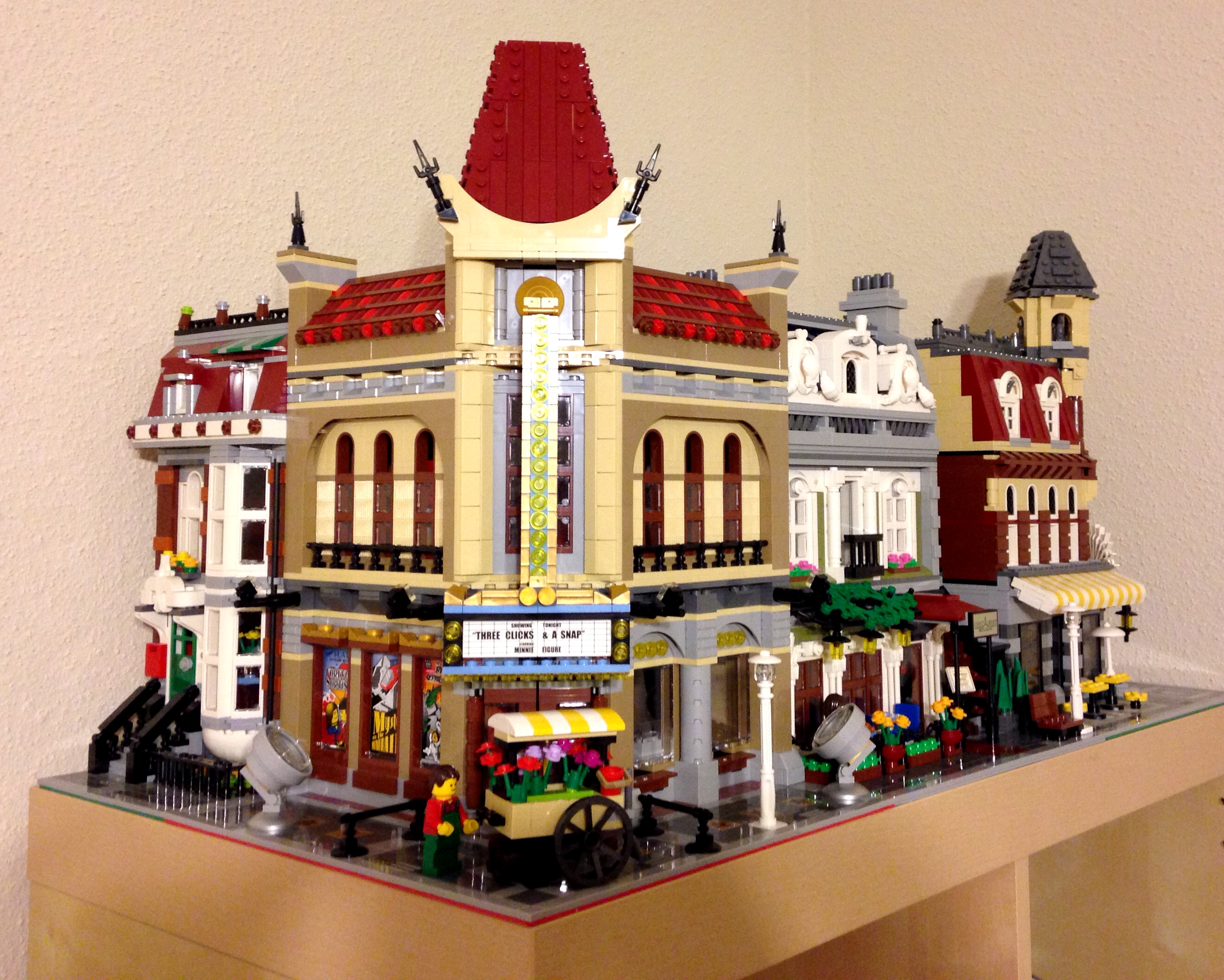 Here’s how it looks nestled into place between the Palace Theater and the old Cafe Corner. I had to split apart and move the Townhouse/Pet shop to the back corners to make room for another full size building.