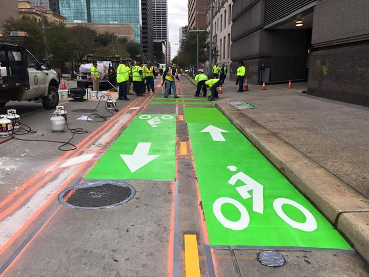 Lamar Street, in downtown. It’s officially underway! It’s just one street so far, but I am hoping it is just the beginning of a growing network of such lanes throughout the city and surrounding areas. There is a large cycling community in this city – not just spandex clad roadies, but people who rely on bikes as their primary mode of transportation.