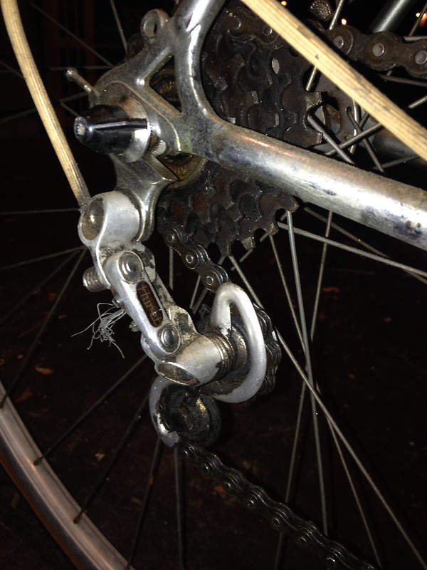 Since I couldn’t use the Maillard freewheel, I needed a new one – so back to eBay I went and found a 5 speed from Shimano. Nothing fancy, just a Uniglide low-end one that would work for now. Full disclosure: once I had the bike together and testing everything before riding I discovered the largest ring on the freewheel I got is too big for the rear derailleur to handle. The original Maillard one was geared 14-17-19-21-24, but the Shimano one I got was 14-28, and while it barely gets the chain onto the large ring, it won’t stay smoothly. Thankfully, there are other companies that make older style 14-24 freewheels so I’ll pick one up in the future. Thankfully, Houston is pretty flat so I rarely need the easy gears anyway.
