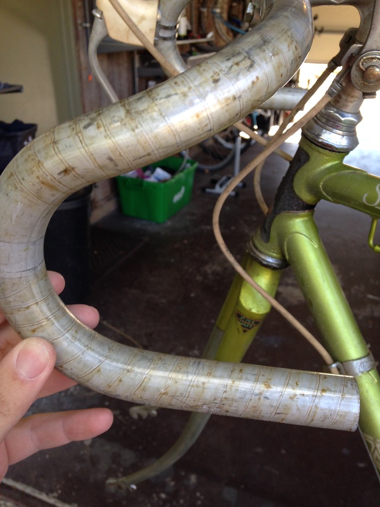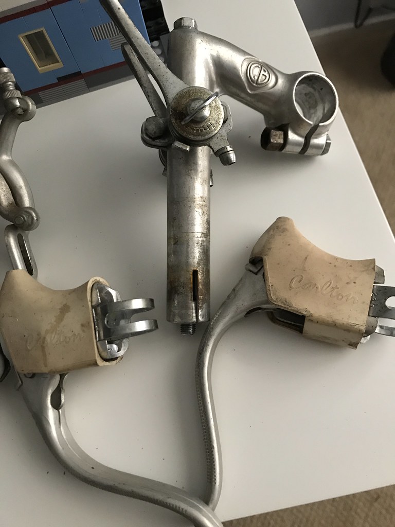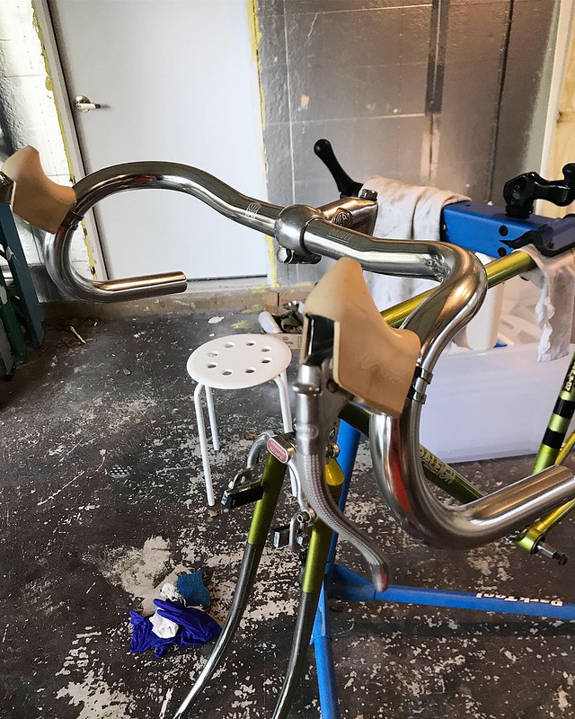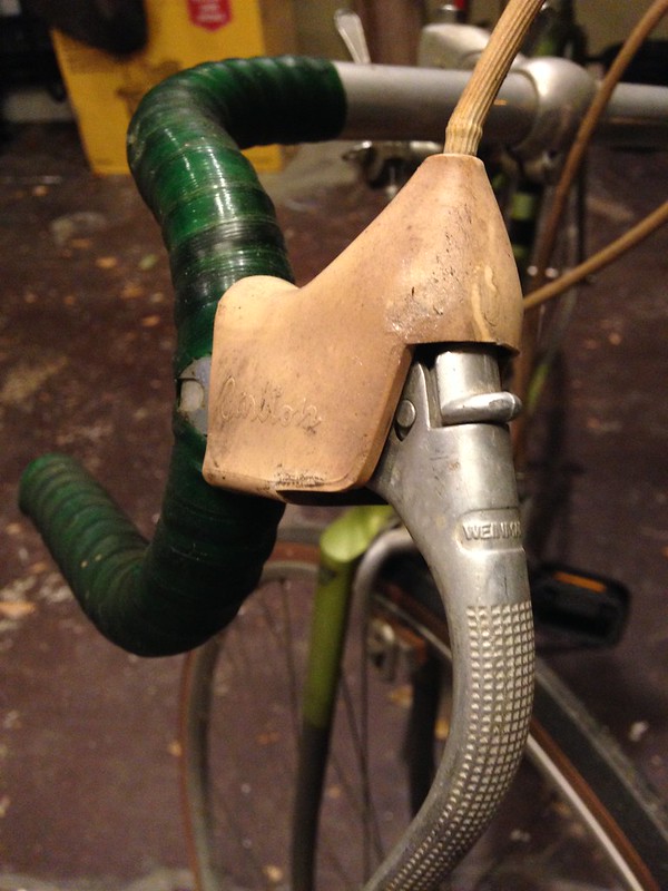I’ll admit I wasn’t in love with the combination of the bars & the hoods. The angle of the hoods combined with the shape of the levers made it really hard for my smaller hands to pull the levers effectively. This, combined with the notoriously unreliable braking quality of those 70’s Weinmann side-pull brakes, made the whole thing rather uncomfortable to ride. It had been 2 weeks, and I already needed to change stuff. But, such is bike life.