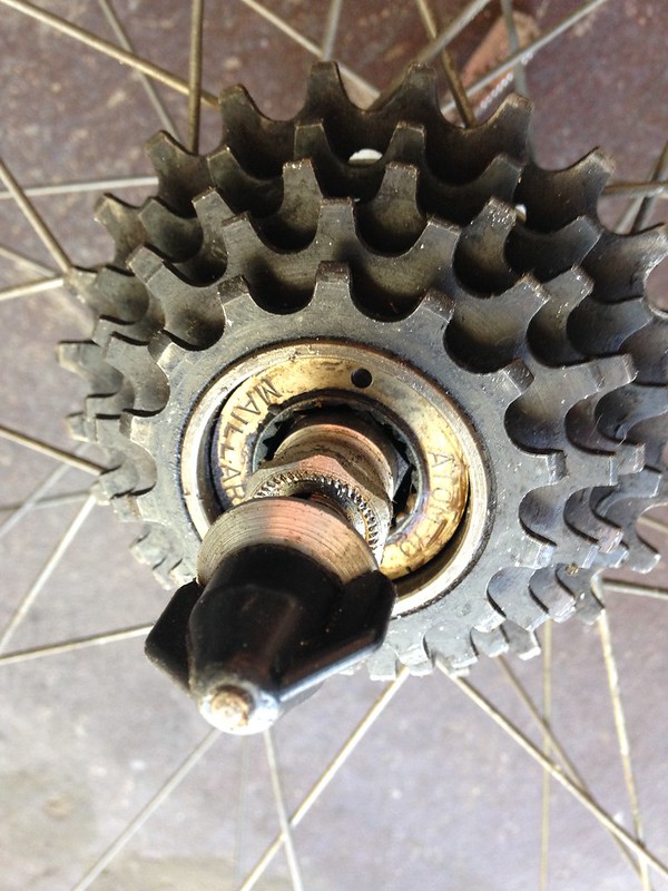 I didn’t get a pic of them after I cleaned them up, so here’s a dirty one. But, they look lovely. So the next beautiful vintage bike I come across with bum wheels will have these hubs and a 5-speed freewheel ready to go.