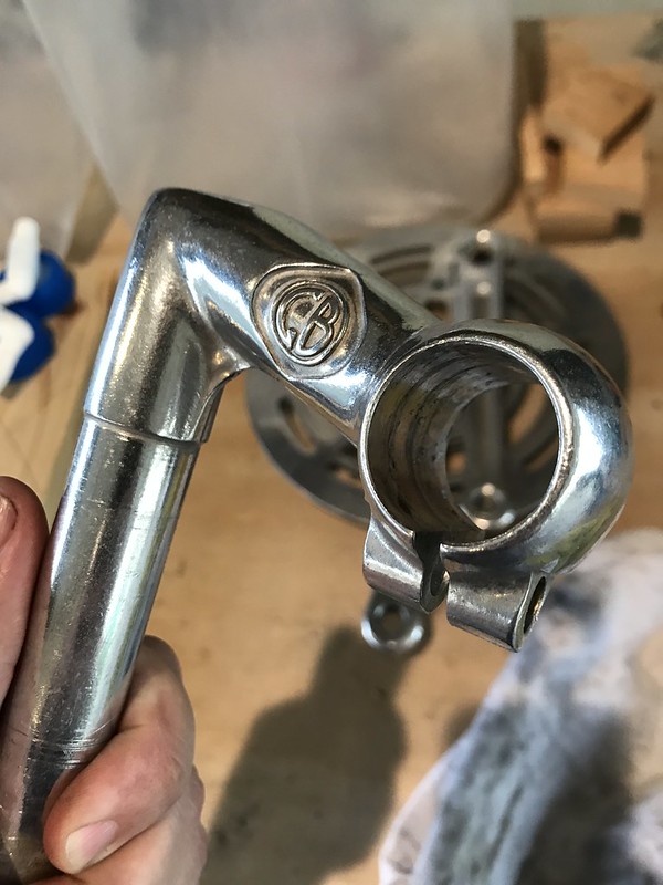 I had to turn to eBay for the downtube shifters. At first I made the mistake of just buying a shifter clamp – but turns out the levers that were attached to the stem were attached to that specific mount and couldn’t be transposed to the downtube clamp. So I wasted $20, but whatever, lesson learned! So back to eBay I went and found a Huret NOS downtube clamp with levers, so I was back in business. It was important to find a Huret model as I wanted to keep it periodic specific and consistent. It already had cables attached, and was ready to go after I clamped it on.