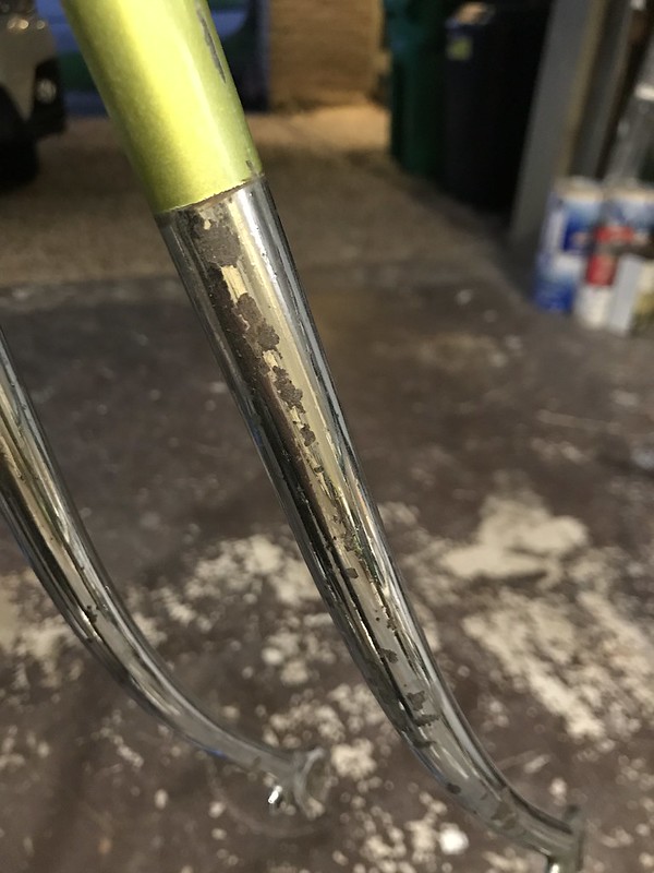 Once I got the main parts off, I went after the frame to get it as sparkly as possible and removed as much rust as I could. The Nevr-Dull worked pretty well, as did the aluminum foil trick. It took a little time and elbow-grease, but it came out well enough for a 45 year old bike. The rust blotched came off the chrome fork and stays, but there wasn’t much I could do about the actual damage to the metal. With the rust gone, I cleaned the areas and then waxed the entire frame for some protection. Close up, you can see the damage easily, but its much less obvious when standing back and looking at the bike as a whole. See pics below: