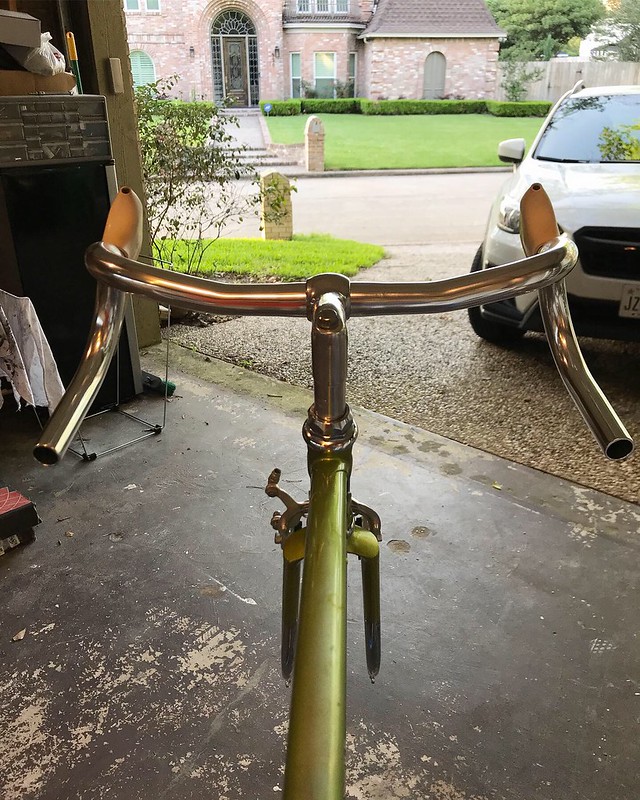 I figured I wasn’t going to find an angle that worked with the older brake hoods on drop bars because of how they connect, and because of how the brake cables were done they levers were reversed (this was purely an aesthetic choice). So, I decided to try riser bars and get it closer to the original. I went with Soma’s Late Riser Bar, with it’s low rise and minimal back sweep angle.