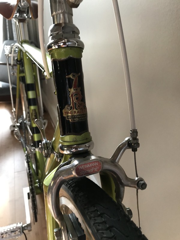 With these new parts all assembled, now, I was finally done, for real! I’ve been riding it this way for the last few weeks and it’s markedly more comfortable. The only think left to do is to switch out the Weinmann brakes because frankly they kinda suck. I found another old set of brakes in a parts swap so I’m going to try those – they’re even Raleigh branded.