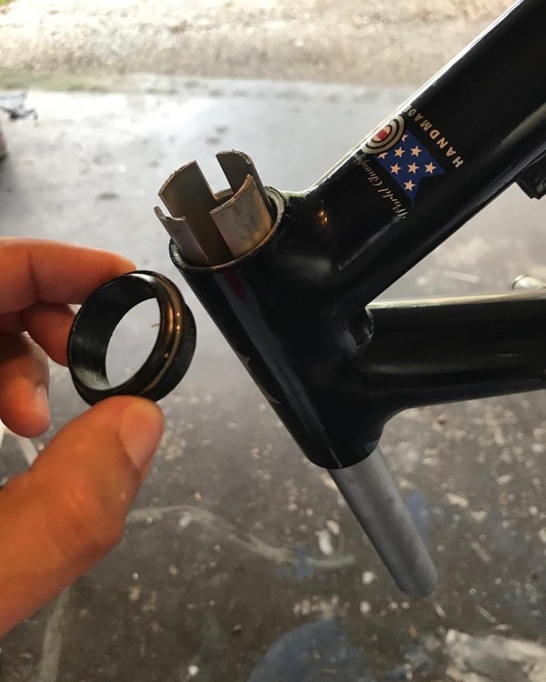 Once the fork was in and the locknut was on, I could start fitting the adapter & the stem. There’s nothing special about adding these pieces, but I did run into a small issue. The length the fork was cut made fitting the right amount of spacers to fill the gaps a bit tricky. You’ll notice in the 3rd pic above there is a small amount of available threads at the top of the fork.