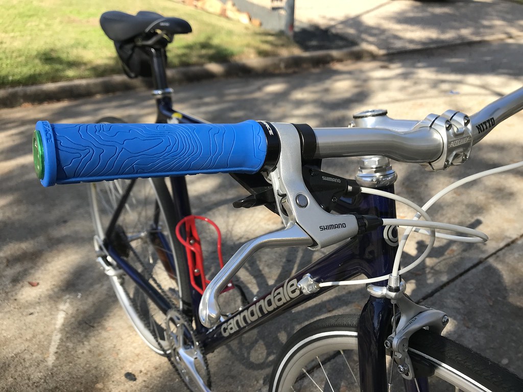 There’s no shortage of badass grips out there for the flat bar single-speed & fixie crowd. I ended up falling in love with RaceFace’s Half Nelson grips. They come in a lot of colors, and are covered in a sweet topographic design! Between my wife being a geologist & myself a science teacher I basically couldn’t not get them. They’re not the the cushiest, but the material offers an excellent grip.