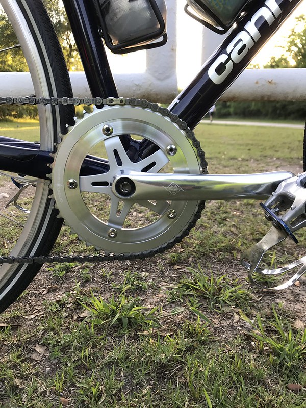 So in order to make it easier to sell I pulled off the pricey parts to keep for another future build, and picked up some much more cost effective, but nice, components. Now it’s got drop bars again, typical integrated brake/shift levers, and a new crankset with a new look and smaller chainring to ease the pedaling woes.